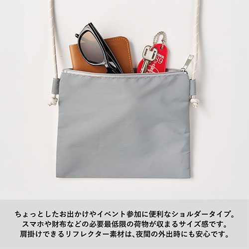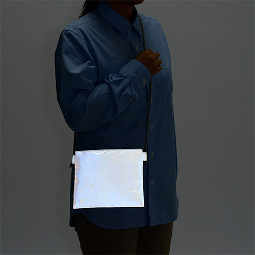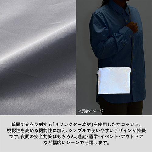 光を反射して夜道の安全を守るリフレクターサコッシュ。スマホや鍵を携帯するのに便利なサイズで、散歩やレジャーに最適です。防犯・交通安全を意識したノベルティに最適。