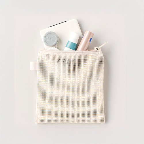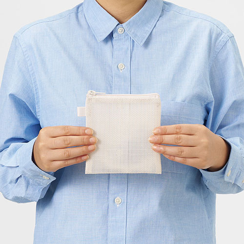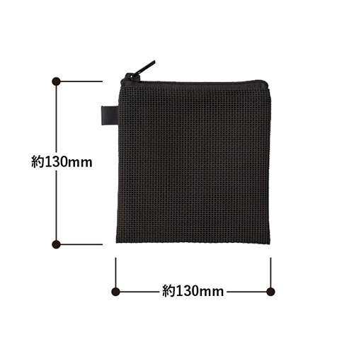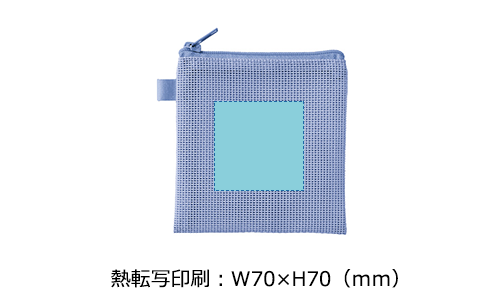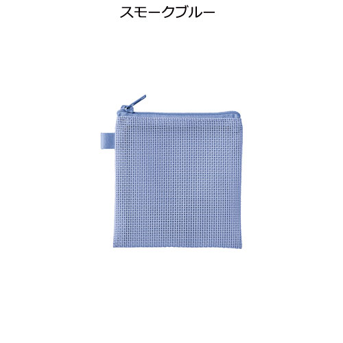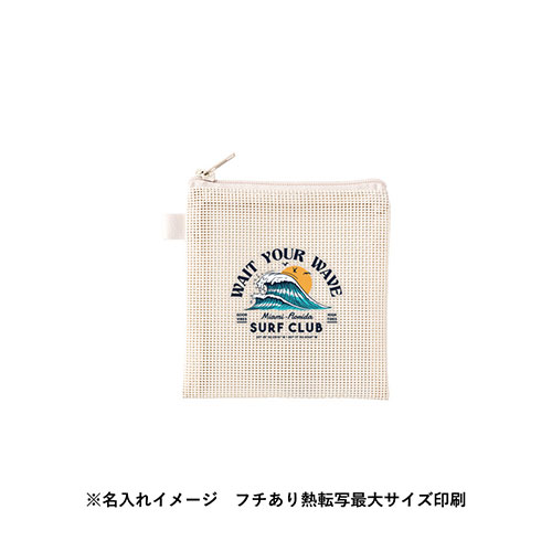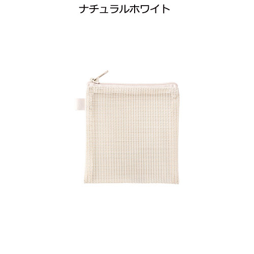 中身が見えるメッシュ素材のSSサイズのフラットポーチ。ループ付きでカスタムしやすく、ワントーンの統一感あるデザインが魅力です。フルカラー名入れが可能でノベルティに最適です。