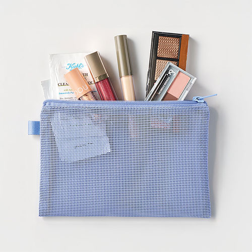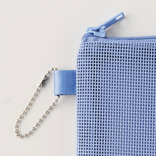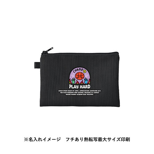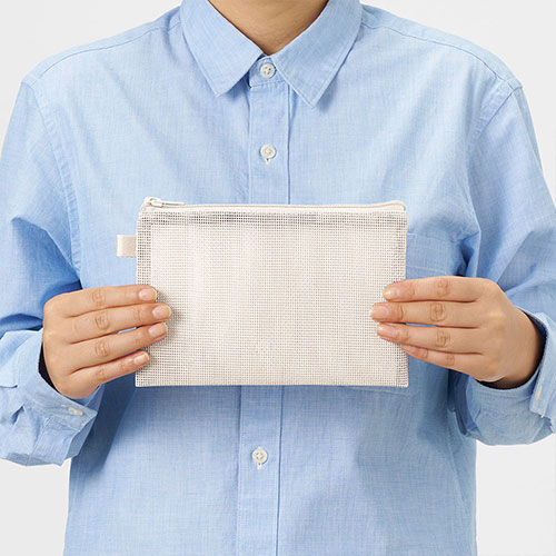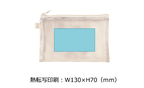 中身が見えるメッシュ素材のSサイズのフラットポーチ。ループ付きでカスタムしやすく、ワントーンの統一感あるデザインが魅力です。フルカラー名入れが可能でノベルティに最適です。