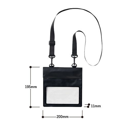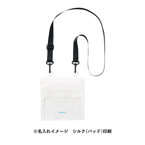 スマホを入れたまま操作できる、防水仕様のサコッシュ。貴重品も入るサイズ感で、夏のレジャーや冬のスポーツに最適です。調整可能なショルダー紐付き。ノベルティに重宝します。