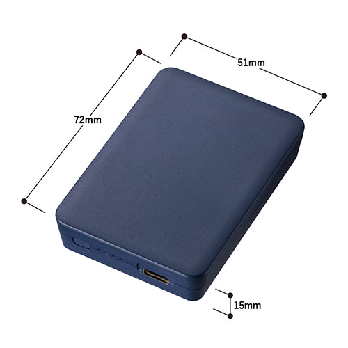 カラー展開 全3色素材 ABS 他サイズ W51×H72×D15(mm)重量 約63g機能 最大出力1A、バッテリー容量2500mAh付属品 取説付、Type-Cケーブル付属、残量表示ランプ付包装 エアパッキン、紙箱