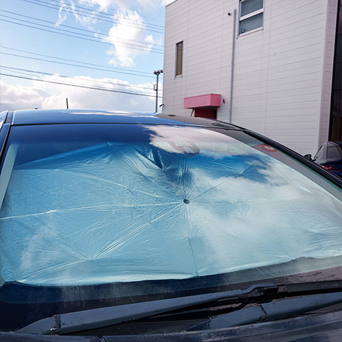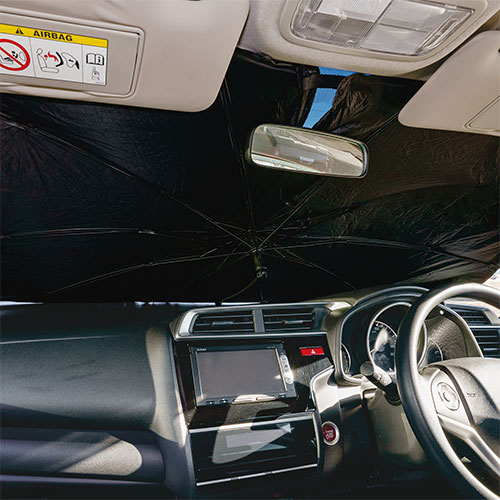 傘のようにパッと広げて設置できる、車用フロントサンシェード。中棒が折り曲がる設計で、ダッシュボードやモニターに干渉せず設置可能です。手軽に車内の温度上昇を防げます。