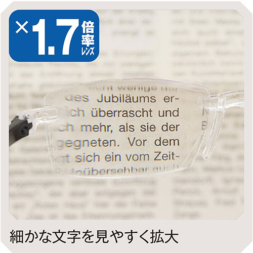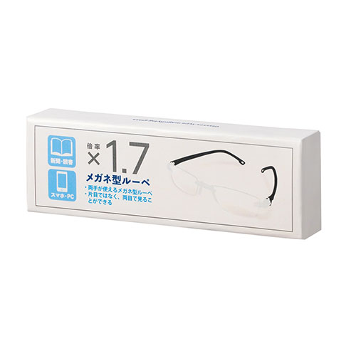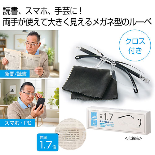 読書やスマホ、手芸に最適なメガネ型ルーペ。ハッキリ大きく見えて両手が自由に使えるため、新聞や細かい作業もストレスなく楽しめます。シニア向けの景品やギフトにも喜ばれる一品です。