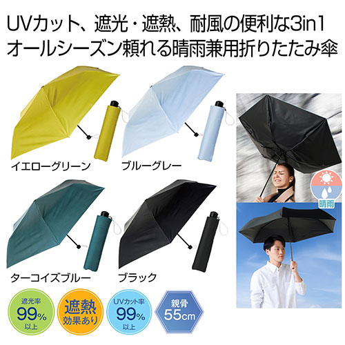UVカット・耐風・遮光遮熱の3機能を備えた実用的な晴雨兼用傘。遮光・遮熱率99%以上で日差しも雨も防ぎます。男女問わず使いやすい4色展開。記念品としても喜ばれる一品です。