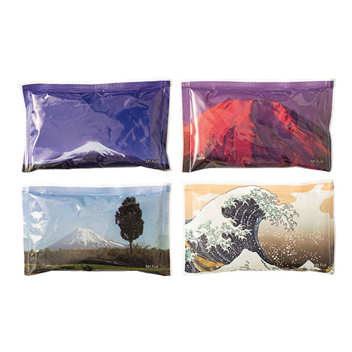 富士山の写真や絵をフィルムに配した、富士山の湧水使用の保冷剤。全49種類がランダムに入っており、選ぶ楽しさも提供します。贈り物や手土産にぴったりの遊び心あふれる一品です。