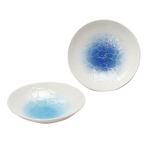 煌めく海をイメージし、水面のような色の変化を楽しめる美しい器です。表面の特殊な凹凸加工が光を反射し、見る角度で豊かな表情を見せてくれます。電子レンジや食洗機にも対応しております。