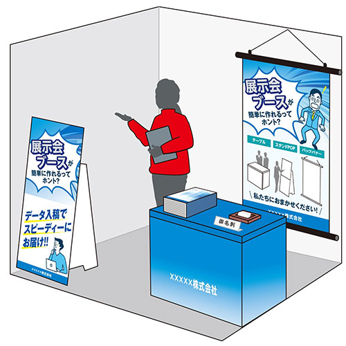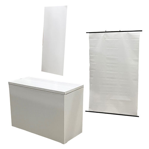 イベントスペースや展示会ブースを華やかに彩る、おトクな3点セット。オリジナルデザインで一式制作でき、ブランドの魅力を効果的に訴求します。統一感のあるブース設営がこれだけで完結。