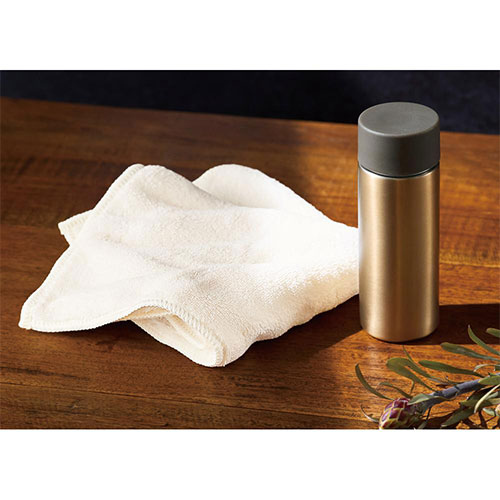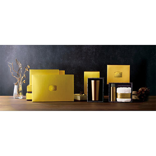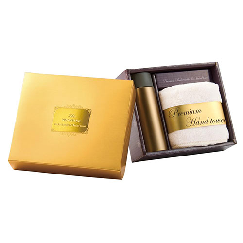外出時に役立つミニボトルとハンドタオルの実用的なセット。ゴールドの帯をあしらったタオルが特別感を演出し、しっかりとした身蓋式の化粧箱が贈答品としての格を高めます。
