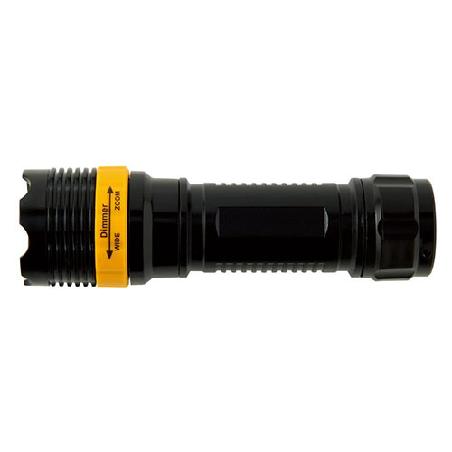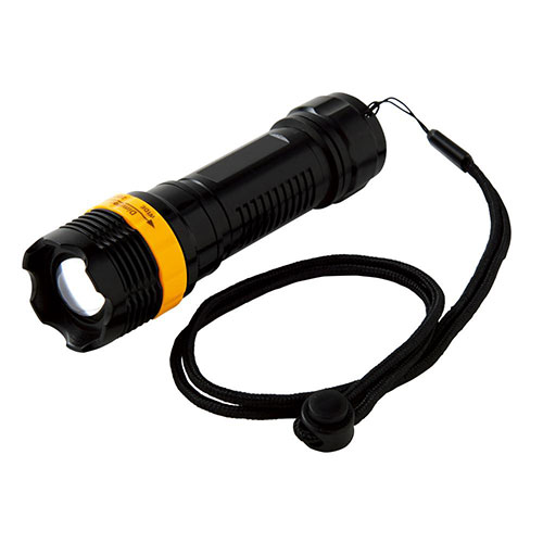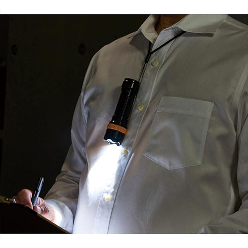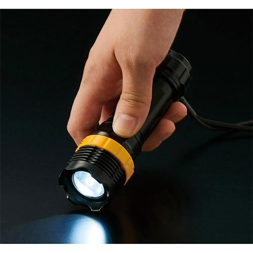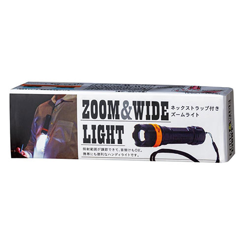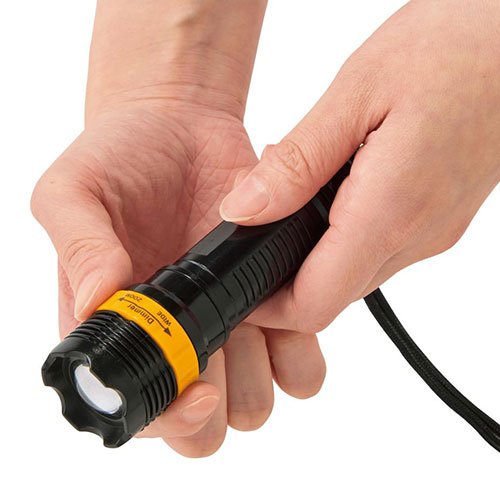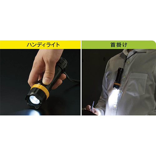 一点集中から広範囲まで照らせる、ネックストラップ付きハンディーライト。照射範囲の調整や、強弱・点滅の3モード切り替えが可能です。アウトドアや災害時の備えにも最適。