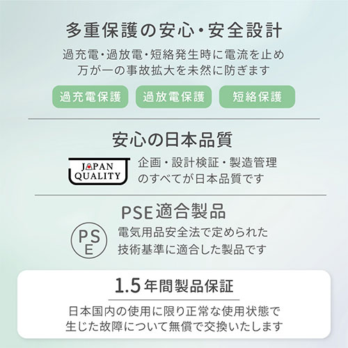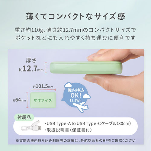 カラー展開 全4色サイズ W約64×D101.5×H12.7mm容量 【バッテリー容量】5000mAh重量 約110g機能 【コネクタ形状(出力)】USB Type-C×1、USB Type-A×1【コネクタ形状(入力)】USB Type-C×1付属品 取扱説明書兼保証書、USB Type-A to USB Type-Cケーブル(30cm)注意事項 接続する機器に合わせた給電ケーブルをご用意ください備考 【PSEマーク】安心・安全のPSE適合製品です【保証期間】1.5年間