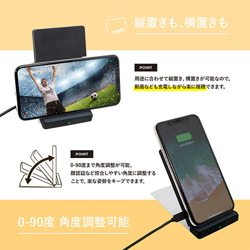 コンパクトで角度調整自在なワイヤレス充電器。2コイル搭載で縦横どちらでも充電でき、QC2.0に対応しています。Qi認定の安全設計と状態表示LED、2年保証付き。