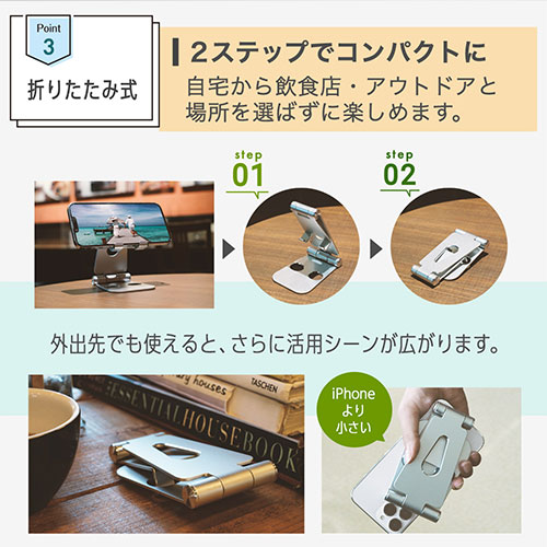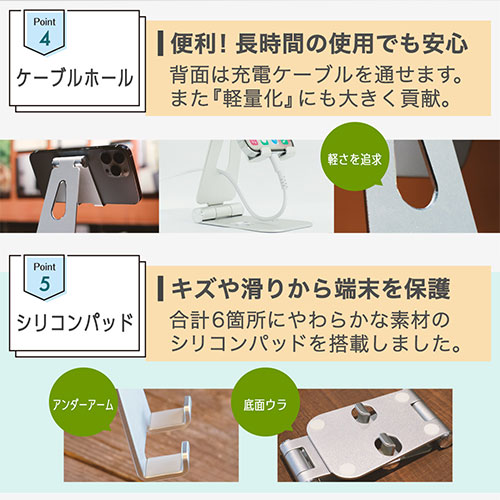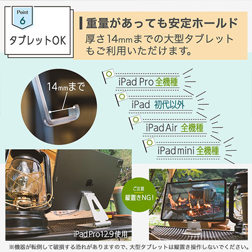 カラー展開 全2色素材 アルミニウム、シリコンサイズ W約76×D27×H130mm重量 約162g機能 【対応機種】各種スマートフォン・タブレット(厚さ約13mmまで)付属品 キズ防止用シリコンパッド×1注意事項 機器が転倒して破損する恐れがありますので立てかけた状態で操作はしないで下さい備考 【保証期間】初期不良のみ交換保証