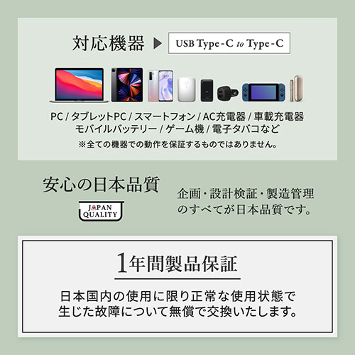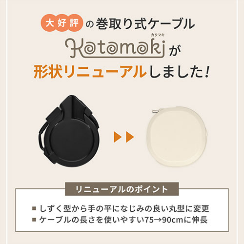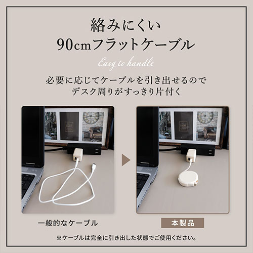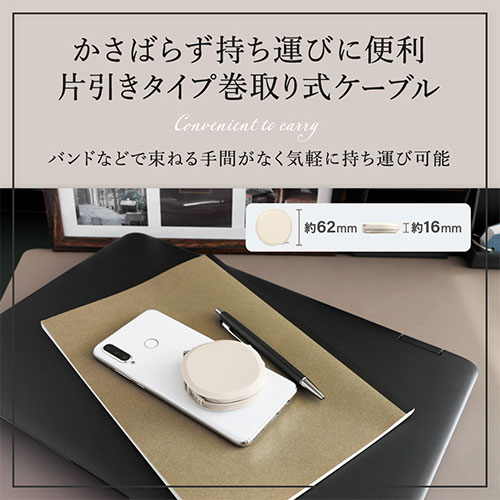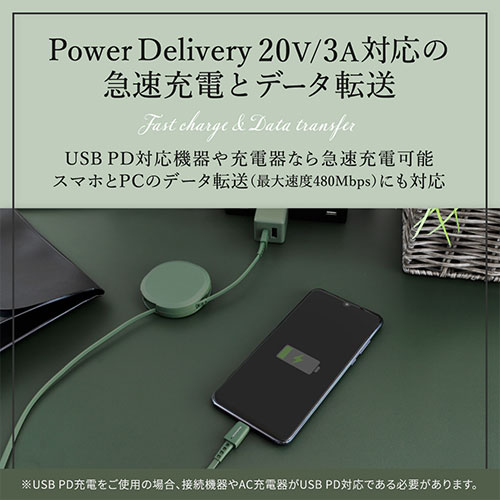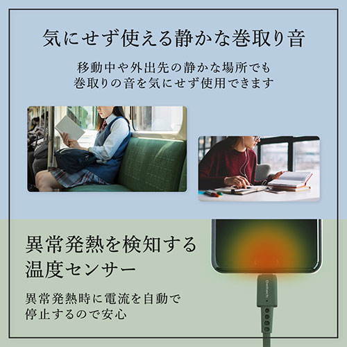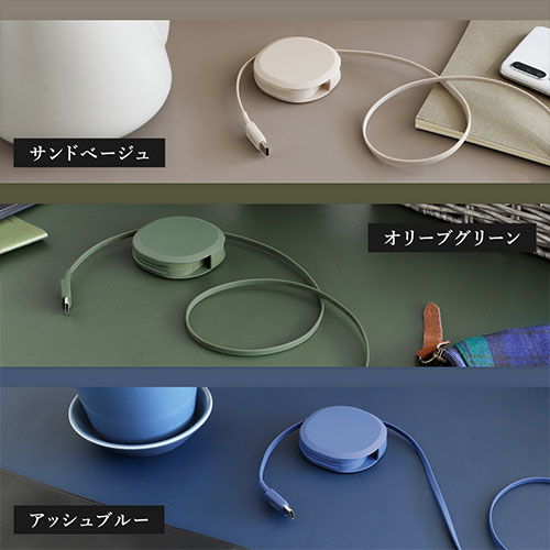 巻取り式の弱点を克服したスムーズな「片引きタイプ」が、WEB限定アースカラーで登場。PD60W充電とデータ転送に対応。温度センサーや厳しい耐久試験をクリアした1年保証付き。