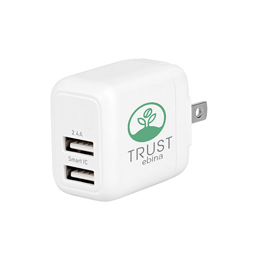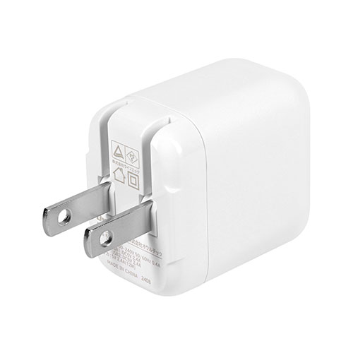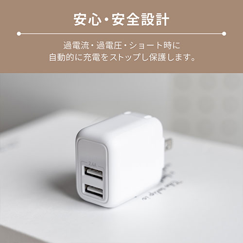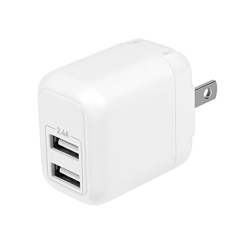 コンパクトなAC充電器。折りたたみプラグで持ち運びに最適です。『かしこく充電』対応のType-Aポートで、2台同時の効率的な充電が可能。安心の2年保証を備えた安全設計です。