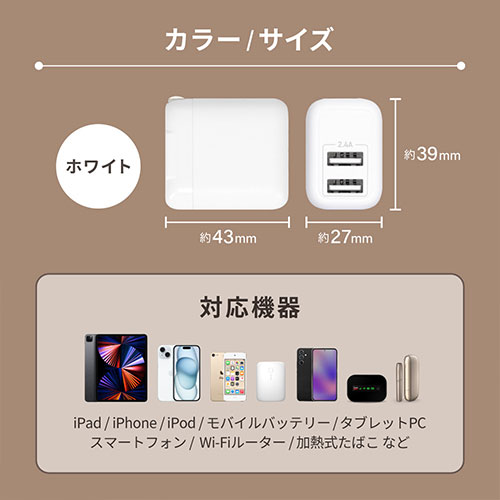 サイズ W約27×D43×H39mm重量 約40g機能 【コネクタ形状(出力)】USB Type-A×2【コネクタ形状(入力)】AC注意事項 別途、各端末に対応したケーブルをご用意ください。備考 【PSEマーク】安心・安全のPSE適合製品です【保証期間】2年間