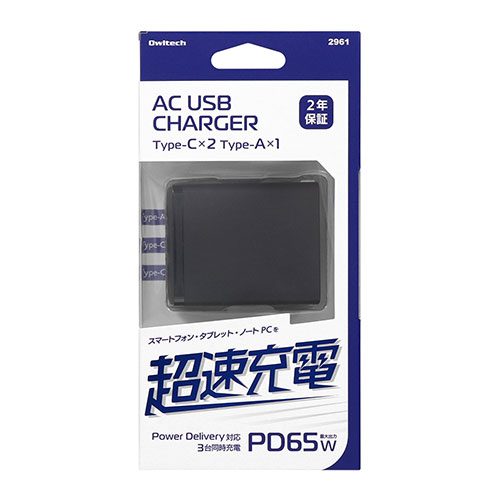 オウルテック 最大PD65W出力 GaN採用 USB Type-C×2 USB Type-A×1 AC充電器