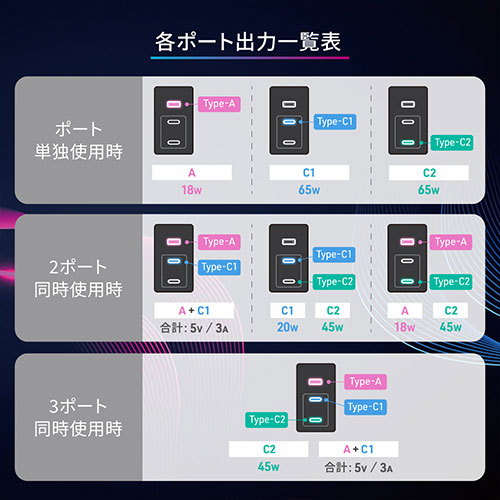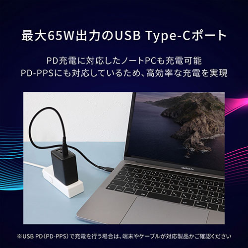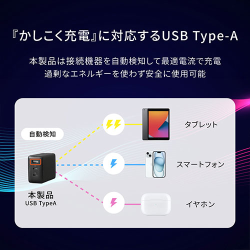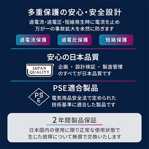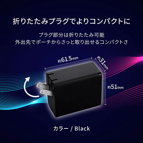 GaN(窒化ガリウム)採用で、最大65Wの高出力をコンパクトに実現。3台同時充電が可能です。Type-Aや折りたたみプラグ、多重保護、PSE適合、2年保証を備えた安心設計です。