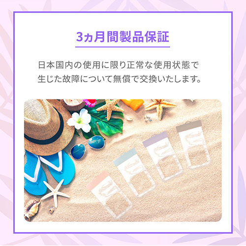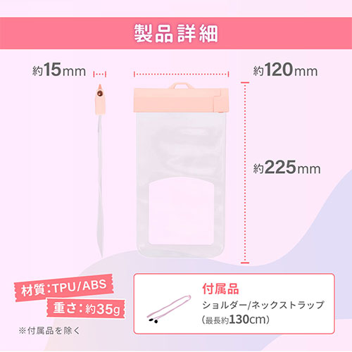 カラー展開 全4色素材 ABS、TPUサイズ W約120×D15×H225mm重量 約39g付属品 ショルダー/ネックストラップ、防水チェックシート、取扱説明書(保証書付)注意事項 本製品は簡易防水を目的に作られております。防水チェック前の水中での使用、水上および水中スポーツでの使用は絶対におやめください備考 【保証期間】3ヵ月