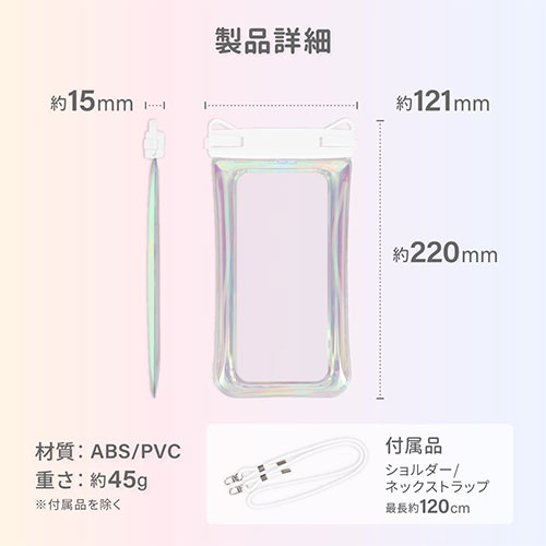 カラー展開 全2色素材 ABS、TPUサイズ W約121×D15×H222mm重量 約45g付属品 ショルダー/ネックストラップ、防水チェックシート、取扱説明書(保証書付)注意事項 本製品は簡易防水を目的に作られております。防水チェック前の水中での使用、水上および水中スポーツでの使用は絶対におやめください備考 【保証期間】3ヵ月