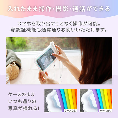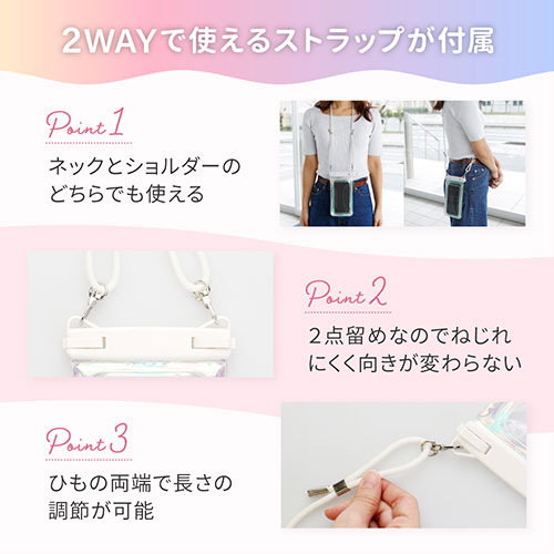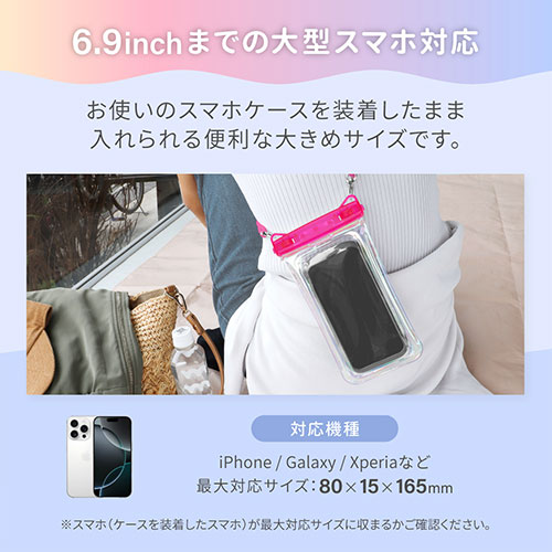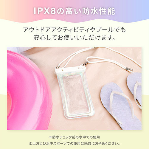 キラキラ光るオーロラカラーと蓄光素材で、暗所でも見つけやすい防水ケース。最高等級IPX8取得で、スムーズな操作や撮影が可能です。2WAYストラップと防水チェックシートが付属。