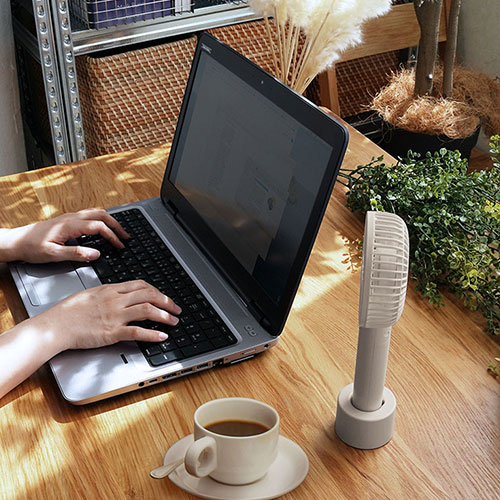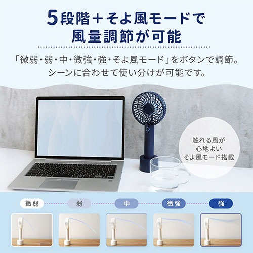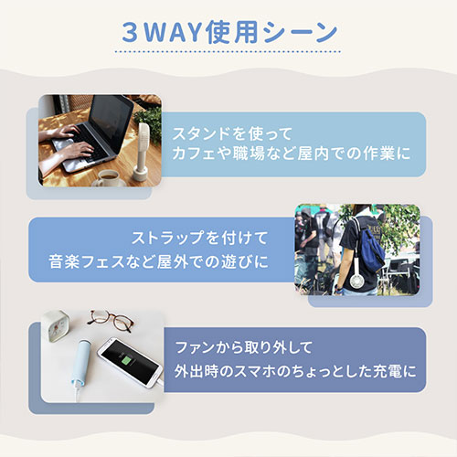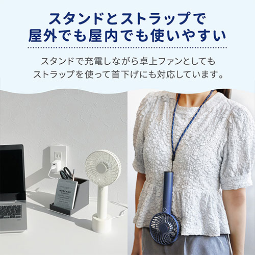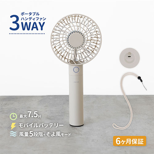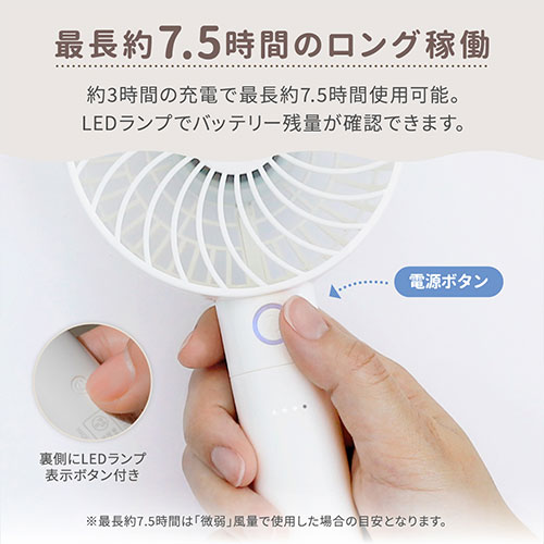 6枚羽の大風量と最長7.5時間稼働を実現。5段階風量に「そよ風モード」も搭載。モバイルバッテリー機能やスタンド、ストラップ付属で便利。多重保護とPSE適合、6ヵ月保証付き。