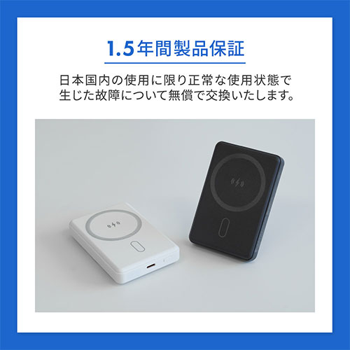 カラー展開 全2色サイズ W約63×D15.5×H94mm容量 【バッテリー容量】5000mAh重量 約133g機能 【コネクタ形状(出力)】USB Type-C×1、ワイヤレス充電【コネクタ形状(入力)】USB Type-C×1付属品 取扱説明書(保証書付)、USB Type-C−USB Type-Cケーブル(約30cm/最大3A充電対応)注意事項 接続する機器に合わせたケーブルをご用意ください備考 【PSEマーク】安心・安全のPSE適合製品です【保証期間】1.5年間