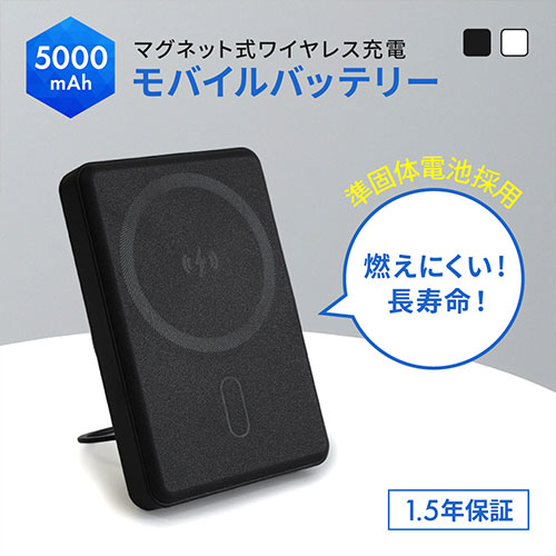 準固体電池を採用した安全で長寿命な5000mAhモデル。最大15Wのワイヤレス充電と20W出力に対応し、2台同時充電も。残量表示やスタンド機能、1.5年保証を備えた安心設計。