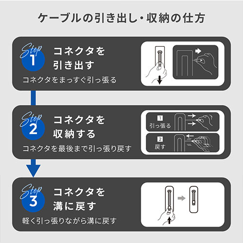 巻き取り式ケーブル一体型で、最大20Wの急速充電が可能。2台同時やパススルー充電、低電流モードにも対応しています。残量は1%単位で表示。1.5年保証を備えた安心設計です。