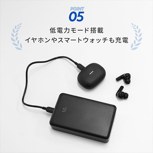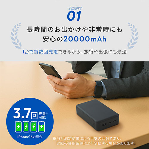 今までにない小型・軽量化を実現した大容量20000mAhモデル。最大20W出力やPPSに対応し、3台同時やパススルー充電、低電流モードも搭載。1年保証を備えた安心設計です。