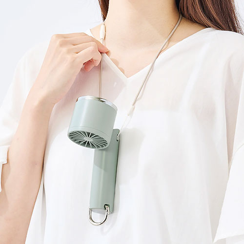 素材 ABS樹脂(本体)、ステンレス鋼(冷却プレート)サイズ 約W58×H168×D60mm(カラビナ折り畳み時)重量 約190g(付属品含まず)機能 充電電池:リチウムイオン蓄電池/3.7V/2,000mAh(保護回路付) 電源:5V/1.0A(USB充電式) 充電時間:約4時間 連続使用時間:送風:約3〜7時間、送風+冷却:約1〜1.5時間 モード:3段階(弱→中→強、各モードで冷却機能ON/OFF)付属品 専用USBケーブル、首掛けストラップ、ユーザーズガイド(保証書含む)