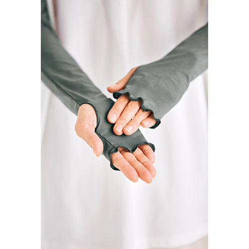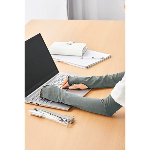 二の腕までしっかりカバーできるロングサイズのUVカットアームカバー。夏場に快適な接触冷感に加え、水に濡らすとさらにヒンヤリ感が増す機能生地を採用しています。夏の必需品。