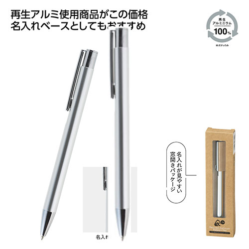 本体に再生アルミニウムを採用し、循環型社会に貢献する地球環境に優しいボールペン。ベーシックなデザインで誰でも使いやすく、日常のあらゆるシーンに馴染みます。実用的な逸品です。
