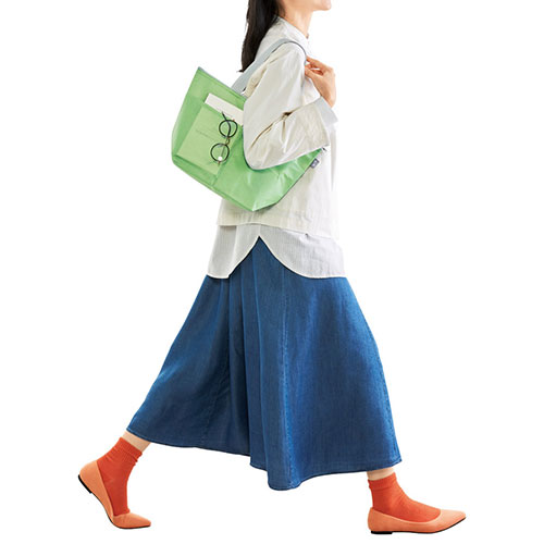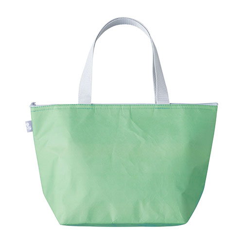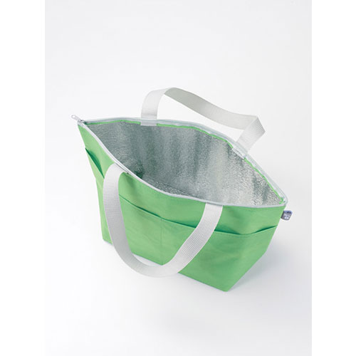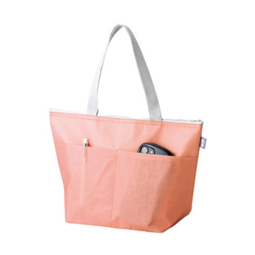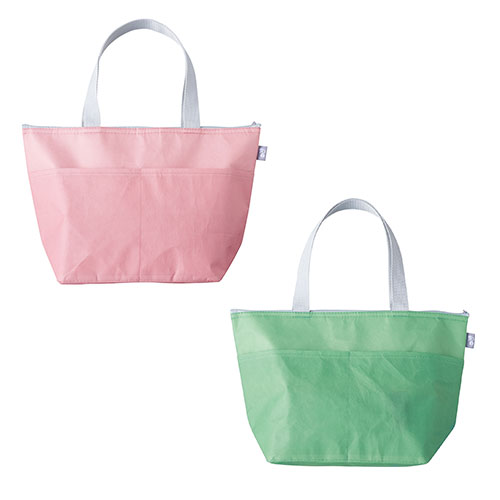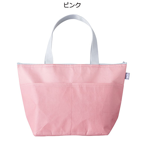 環境にやさしい再生PET生地を使用した、サステナブルな保冷温バッグ。前面にはスマホや財布を収納できる便利なダブルポケット付きです。肩掛けしやすいロングハンドル仕様。