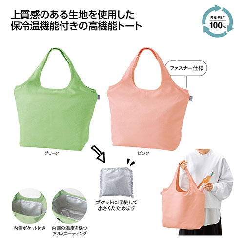 上質な再生PET生地を使用した、環境に優しい保冷温トートバッグ。ファスナー付きで温度をしっかりキープし、内ポケットへコンパクトに収納できる携帯性と高い実用性が魅力です。