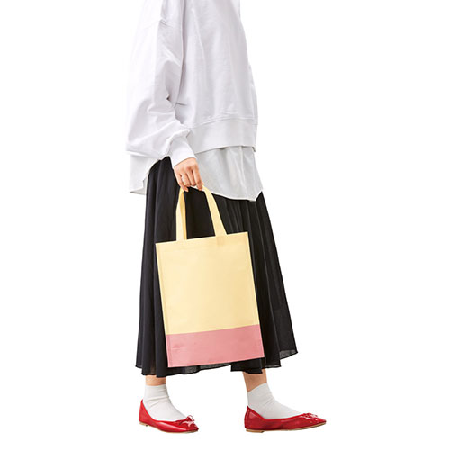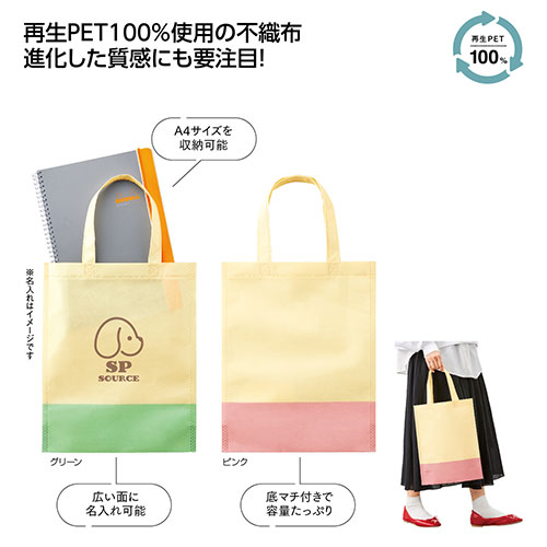 環境にやさしい再生PET生地を使用した、サステナブルなトートバッグ。A4サイズをしっかり収納でき、展示会やイベントでの配布用にも最適です。底マチ付きで見た目以上の収納力あり。