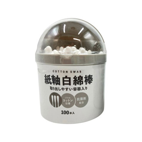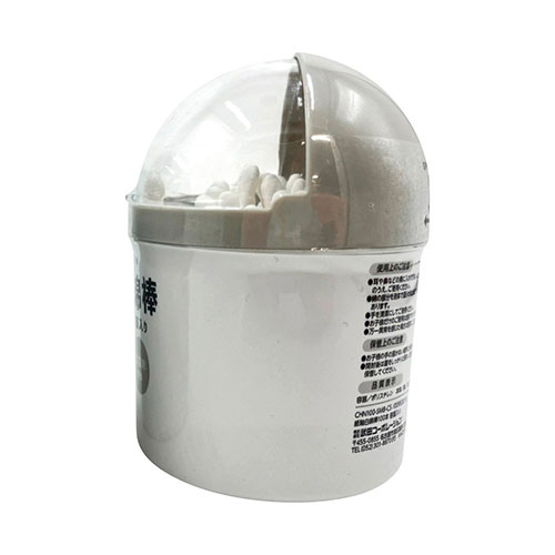 抗菌剤を施した清潔な紙軸の白綿棒。蓋付きで取り出しやすく、衛生的に保管できる容器に入っています。100本入りでたっぷり使え、毎日のケアに重宝。ノベルティとしても喜ばれる一品です。