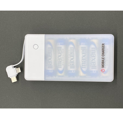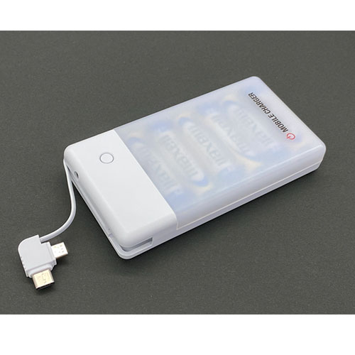 単3形アルカリ乾電池6本を使用する、高出力1.5Aの乾電池式急速充電器です。Type-CとmicroUSBのマルチコネクターに加えUSBポートも備え、幅広い機種に対応。