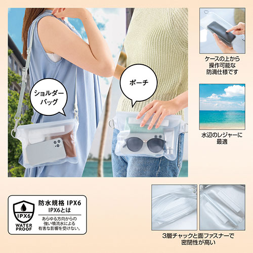 電子機器を水濡れから守りつつ、バッグに入れたまま操作ができる防滴ショルダーバッグ。2WAY仕様で持ち運びやすく、雨の日やアウトドアでも安心して使える実用的な一品です。