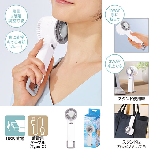 冷却プレートの直接的な冷感と風のダブル効果で涼める、2WAY仕様のハンディファン。便利なカラビナ付きでバッグ等に吊り下げて持ち運びやすく、夏の外出を快適にする一台です。