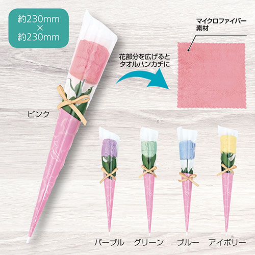 ふんわりとしたマイクロファイバー素材を、華やかなバラの花束のようにラッピングしたミニタオルギフト。優しい肌触りと優れた吸水性を兼ね備え、そのまま手渡せる可愛らしいデザインです。