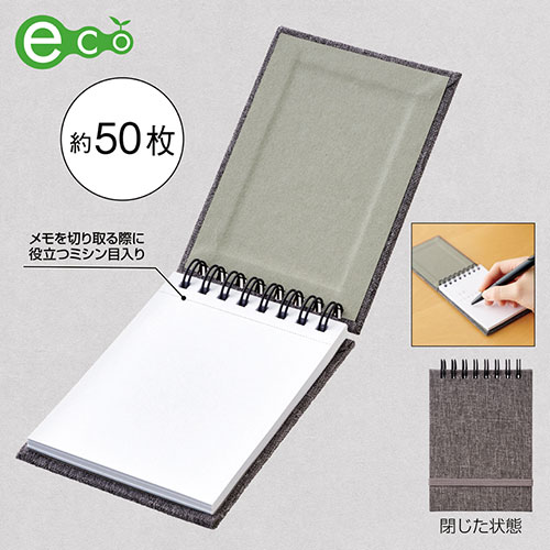 表紙にリサイクルPET生地、メモ用紙に再生紙を使用した、環境への優しさが詰まったエコメモ帳。素材の風合いを活かしたシンプルなデザインが魅力で、実用的な一品です。