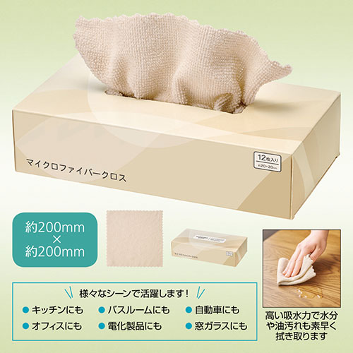 キッチンやリビング、洗車などあらゆる場所の掃除に重宝する、BOX入りのマイクロファイバークロス12枚セット。吸水・速乾性に優れ、サッと取り出して手軽に使える利便性が魅力です。