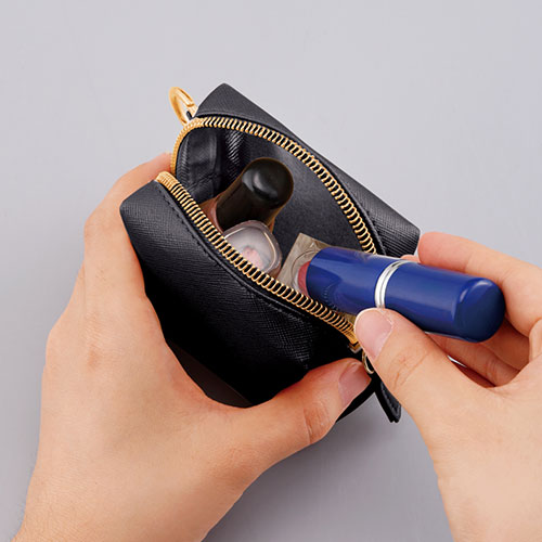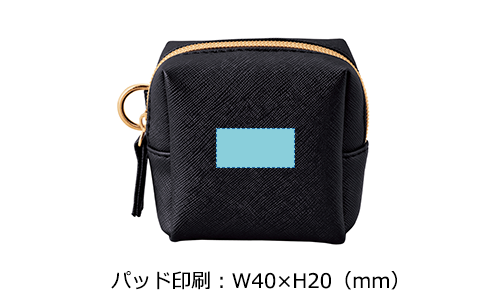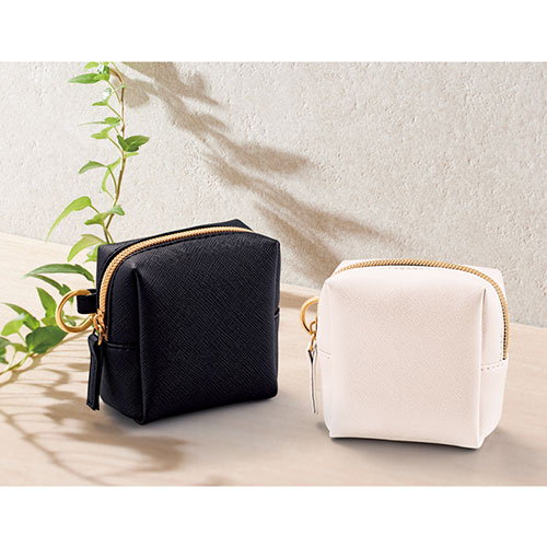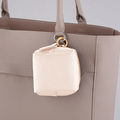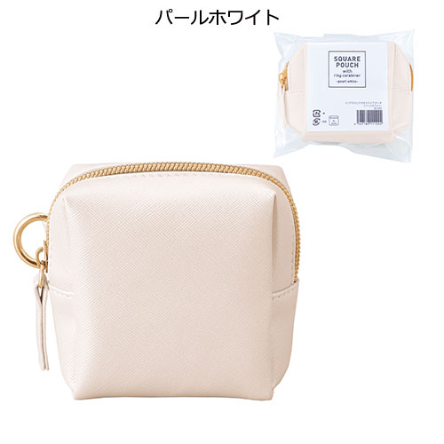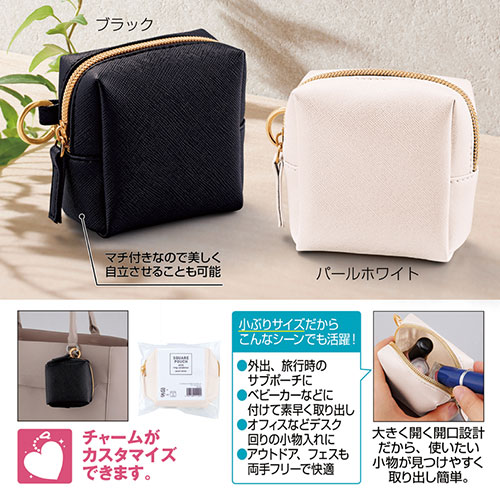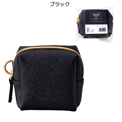 アクセサリー感覚で持ち歩ける、上品な素材感が魅力のスクエア型ミニポーチ。バッグなどに取り付けやすいリングカラビナ付きで、実用性とファッション性を兼ね備えています。