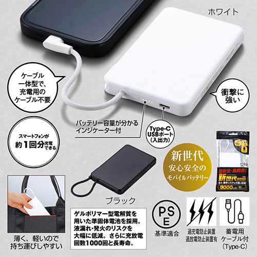 発火リスクを大幅に低減する準固体電池を採用した、安全性の高い新世代モバイルバッテリー。ケーブル一体型のため、これ一台でスマートに充電が始められる利便性が魅力です。