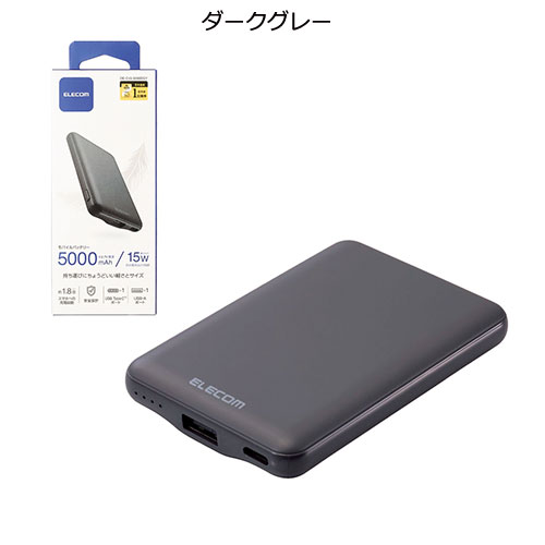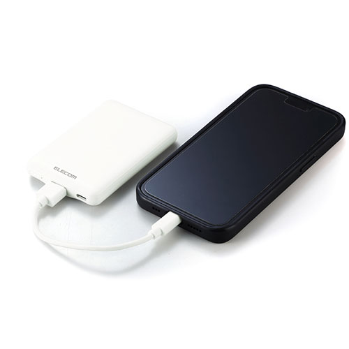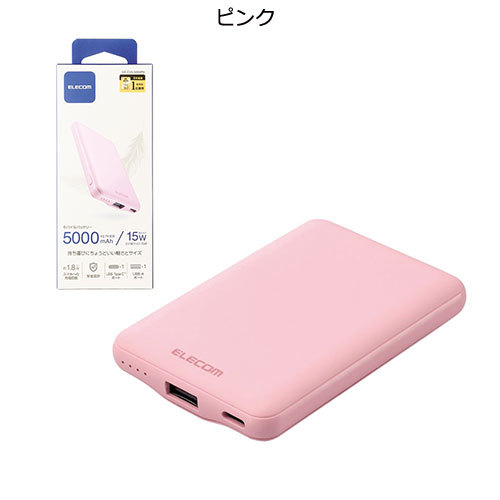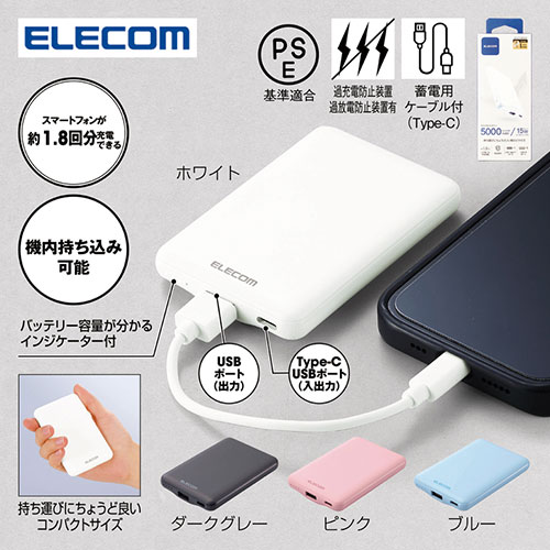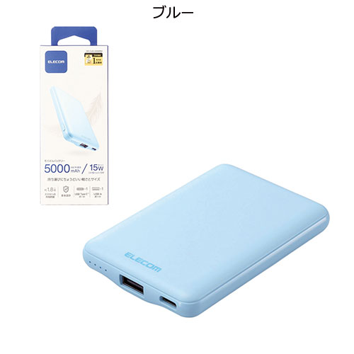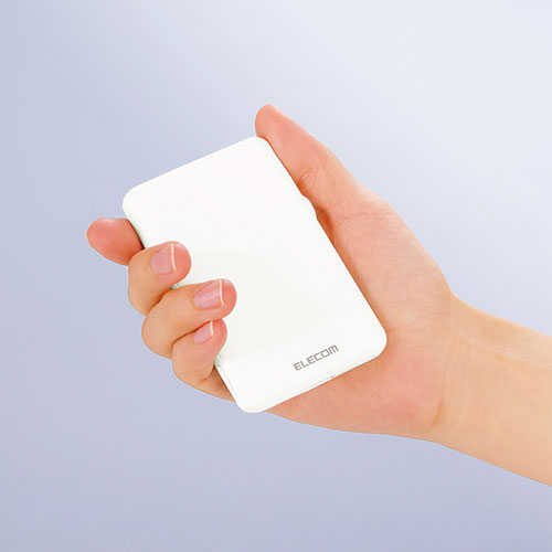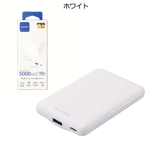 軽量かつ薄型なフォルムで、バッグの隙間にすっきりと収まるエレコム製モバイルバッテリー。コンパクトながら5,000mAhの容量を備え、スマートフォンの充電をしっかりサポートします。