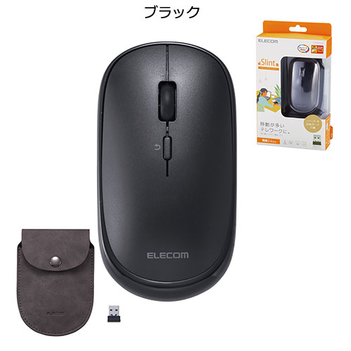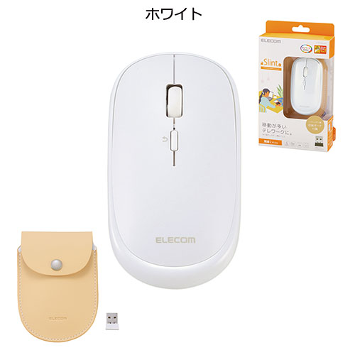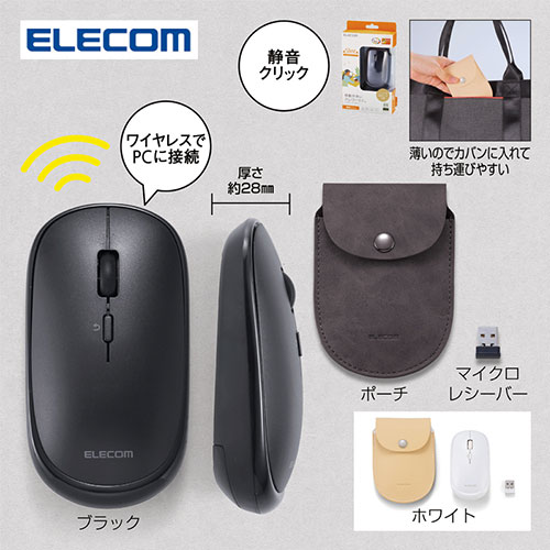 厚さ28mmの薄型設計で、カバンやポケットにすっきりと収まるエレコム製の無線マウス。専用の収納ポーチが付属しており、持ち運び時のキズや汚れから本体をしっかり守ります。