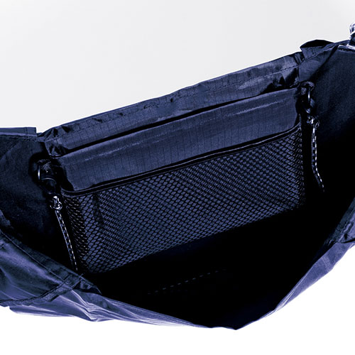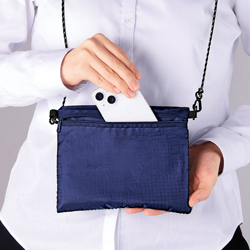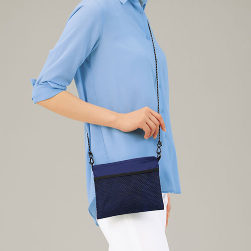 外出時はサコッシュとして軽快に、荷物が増える帰りはエコバッグとして使える便利な2WAY仕様。メッシュポケット付きで小物の整理もスムーズで非常に実用的なアイテムです。