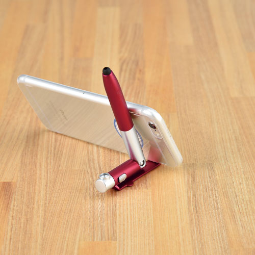 スマホスタンド、タッチペン、そしてライトとしても利用できるためとっても便利なボールペンです。カラーバリエーションはレッド、ブルー、ブラックの3色展開。オリジナル名入れも可能です。