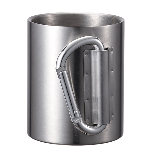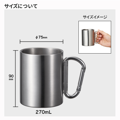 持ち手部分はカラビナになっており折りたたむことも可能で便利なステンレスマグです。名入れプリントできるアイテムですのでオリジナルグッズやノベルティアイテムとしてもおすすめ。
