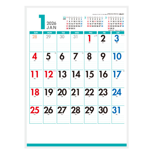 パステル調のカラーラインがおしゃれな、シンプルで見やすいA2サイズのカレンダーです。ケイ線入りで広いメモスペースも特徴。業種を問わず、年末ご挨拶用ノベルティとしてご活用ください。※掲載している価格は、100冊の場合の1冊単価になります。価格については、お見積り依頼後に担当スタッフから別途ご案内いたします。